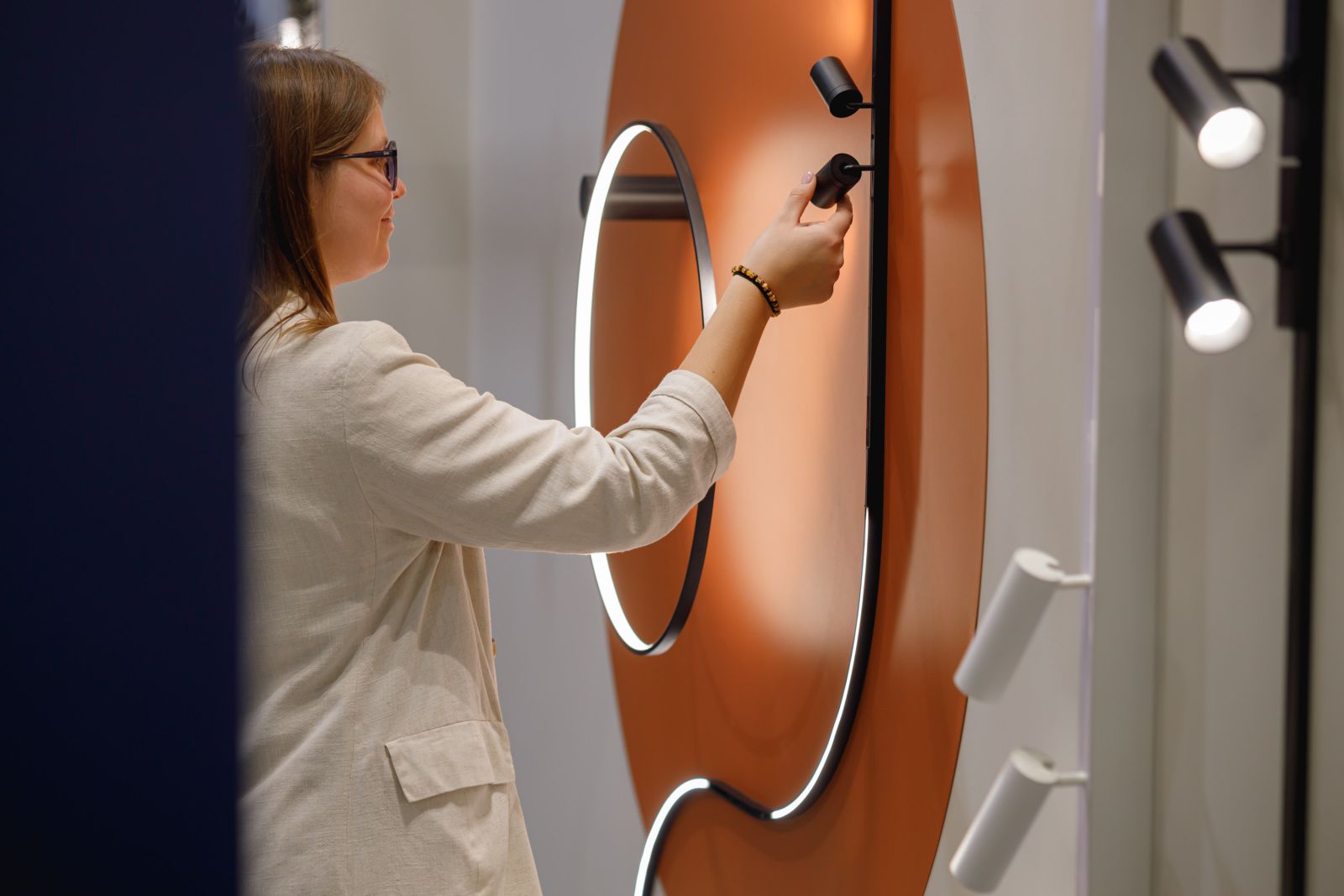 Na stoisku utrzymanym w odważnym kobaltowym odcieniu inspirowanym tegoroczną nowością – lampą Poise multicolour – odwiedzający mogli przenieść się do stref inspirowanych wnętrzami, od salonu i jadalni po łazienkę i ogród. Każda z przestrzeni odzwierciedlała, jak światło wpływa na jej charakter i odbiór.